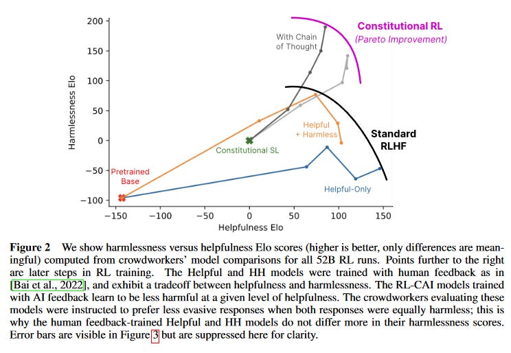 The x-axis shows how “helpful” the AI’s answers are. The y-axis is how "safe” the answers are. Ideally (at least according to the platforms training the models), the goal is a model that is both perfectly helpful and perfectly safe. In practice researchers have found a trade off, where at some level of optimization a more helpful AI is less safe, and a safe AI is a little less helpful. What is cool about the new AI-self-improvement method is it shifts that “pareto frontier” out to the upper left. The most-optimized to date “constitutional model” is still not as helpful as the best “helpful only” model, but it is well past the previous “theoretical trade-off limit”.